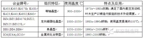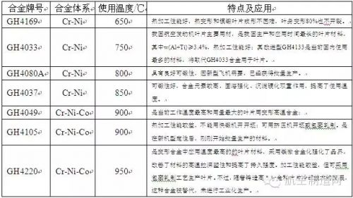 表1 國內(nèi)飛機(jī)葉片用高溫合金牌號(hào)及其工作溫度
