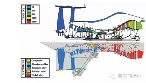 圖 7 羅爾斯-羅伊斯噴氣發(fā)動(dòng)機(jī)內(nèi)溫度和材料分布