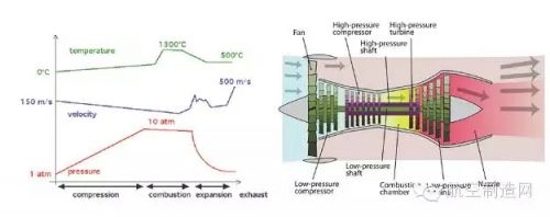 1.發(fā)動(dòng)機(jī)葉片的影響因素發(fā)動(dòng)機(jī)的特殊結(jié)構(gòu)組成及工作原理對(duì)葉片的性能提出了很高的要求,同時(shí)發(fā)動(dòng)機(jī)內(nèi)溫度、氣流和壓力影響著葉片使用情況。航空發(fā)動(dòng)機(jī)主要分民用和軍用兩種。如圖4為普惠公司民用渦輪發(fā)動(dòng)機(jī)主要構(gòu)件圖,圖5為軍用發(fā)動(dòng)機(jī)的工作原理示意圖,圖6為飛機(jī)渦輪發(fā)動(dòng)機(jī)內(nèi)的溫度、氣流速度和壓力分布圖,圖7為羅爾斯-羅伊斯噴氣發(fā)動(dòng)機(jī)內(nèi)溫度和材料分布圖,圖8為航空發(fā)動(dòng)機(jī)用不同材料用量的發(fā)展變化情況圖。