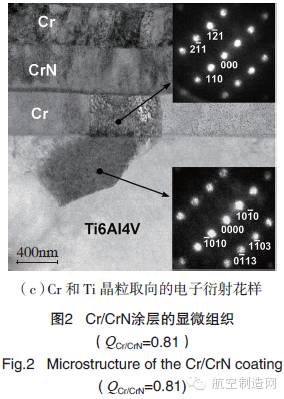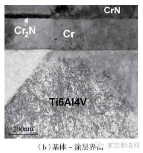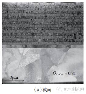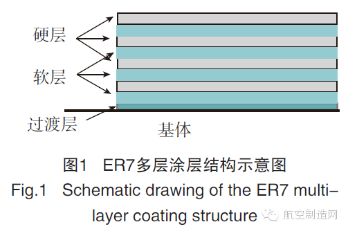 目前,國外主要將二元抗沖蝕涂層用于航空發(fā)動機上,如法國幻影戰(zhàn)機一、二級壓氣機葉片使用TiN 涂層,前蘇聯(lián)也使用TiN、CrC、ZrN 涂層葉片,尤其將TiN 涂層應用于米-24、米-28 直升發(fā)動機引擎螺旋槳及壓氣機轉子葉片上。美國則將TiN 涂層用于CH-46E 海上騎士運輸直升機的引擎螺旋槳葉片,使葉片壽命提高了3~4 倍,英國也通過研究將耐沖蝕涂層用在“山貓”直升機壓氣機葉片上。MDS-PRAD、GE 公司進一步改進抗沖蝕涂層,并將成分分別為TiN 和TiAlN 的ER7 和BlackGold陶瓷涂層用在直升機和運輸機發(fā)動機上。ER7 涂層結構如圖1 所示,該涂層為軟/硬層交替排列結構,并以過渡層與基體結合。與單層涂層相比,ER7 具有更好的斷裂韌性和抗沖擊性能,目前已在渦軸和渦扇發(fā)動機上得到廣泛使用。