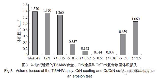 國內外對多元合金化TiAlN、ZrAlN 等涂層、電弧鍍等技術制備的ZrN/TiN 多層納米涂層以及復合的Al/AlN、Ti/TiN、Cr/CrN 涂層等進行了大量研究[7-9]。圖2[10] 為典型Cr/CrN交替的涂層顯微組織,這種復合方式明顯改善了涂層抗沖蝕性能。Cr/CrN 抗沖蝕性能與Cr/CrN的層厚比值Q 密切相關[10],在Q為0.81 時涂層抗沖蝕性能最佳(圖3[10])。復合涂層內的韌性相承受較多的塑性變形,硬質脆性相則發(fā)揮增強涂層抗磨損性能的作用[7]。其他研究結果說明,不只復合方式能提高耐沖蝕性能[4,11],向TiN 涂層中添加鋁的多元合金化也能增強涂層抗沖蝕性能[12]。